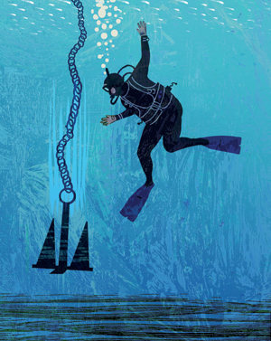 天气正适合潜水,船载着一众人驶向两个沉船潜点。由两名潜水长分别负责在每个新潜点放锚和收锚。当他们到达潜点,另一名潜水长把锚下到了沉船上,用沉重的锁链把锚缠在了沉船的钢梁上以固定锚位。潜水完成后所有潜水员都回到了船上,这时Louis跳进水里做了一次快潜,通常被称为速返潜水,去到沉船上解下船锚并带着船锚向上游一段。一旦船长意识到船锚已经被解开会立即开始起锚,但这中间会有一分钟的时间,所以Louis必须带着船锚游一段路。这中间Louis不能丢掉船锚否则船锚可能会挂在其他东西上。