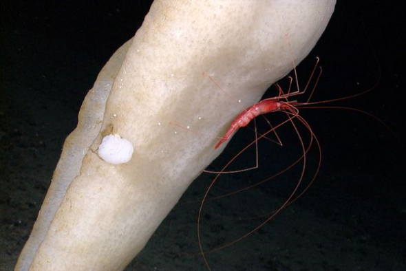 在这张由“俄刻阿洛斯探险者”号探险小组公布的照片中,一只长腿小虾吸附于海绵之上。他们在0.5英里(约合0.8公里)的海洋深处,发现了“公园中的美丽花朵”。据美国国家海洋与大气管理局专家介绍,科学家后来确认它可能是一种新的食肉海绵。新发现的海绵看上去具有粘性玻璃针状物,可以慢慢伸出去捕捉食物——极有可能是路过的浮游生物。
