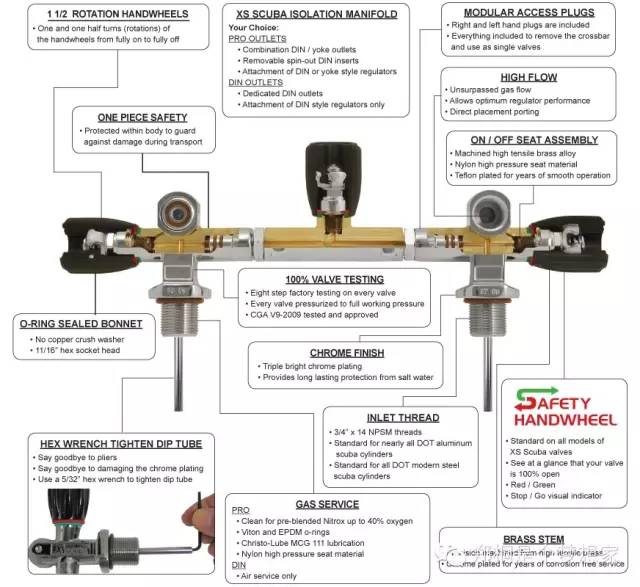 1,省略自己不断切换呼吸器的麻烦,气体可以均匀的在两瓶气中自由流动,假设你一个气瓶是12L,那么等于打满气的情况下,你有一个230BAR的24L大气瓶。