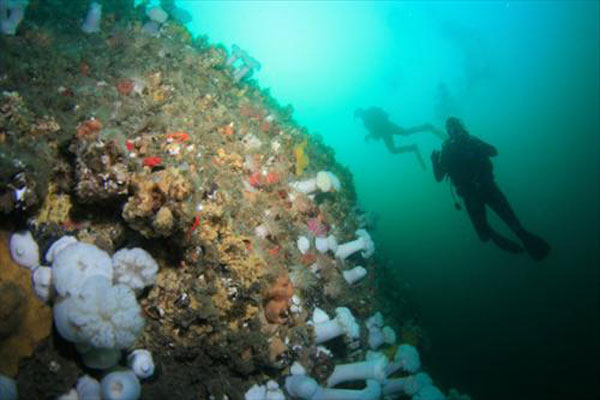 布朗宁峭壁(Browning Wall)被誉为北美最佳峭壁潜水地之一,水下能见度高达30米,想象在近乎垂直的水中深渊峭壁上,琳琅镶满了色彩缤纷的海绵、海葵、海星和珊瑚,是何等壮丽震撼的风景!布朗宁峭壁就是这样一个奇幻的所在,帝王蟹、章鱼、岩鱼在彩虹般的珊瑚礁中安家,绚丽迷幻的色彩,多不胜数的海洋生物,鬼斧神工的峭壁,吸引着潜水者们纷至沓来。