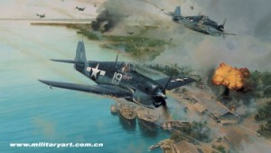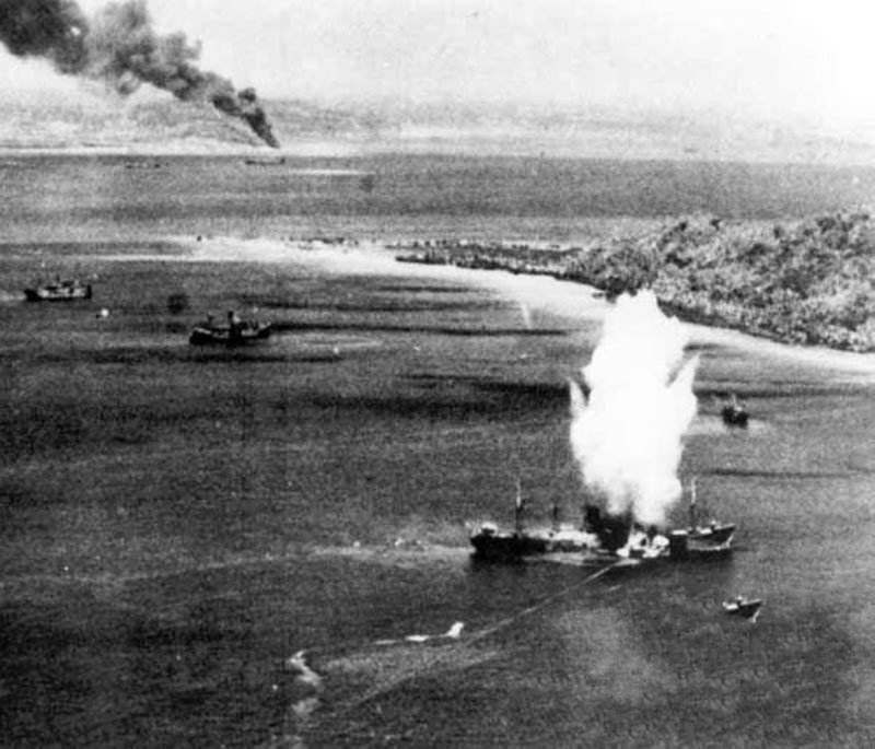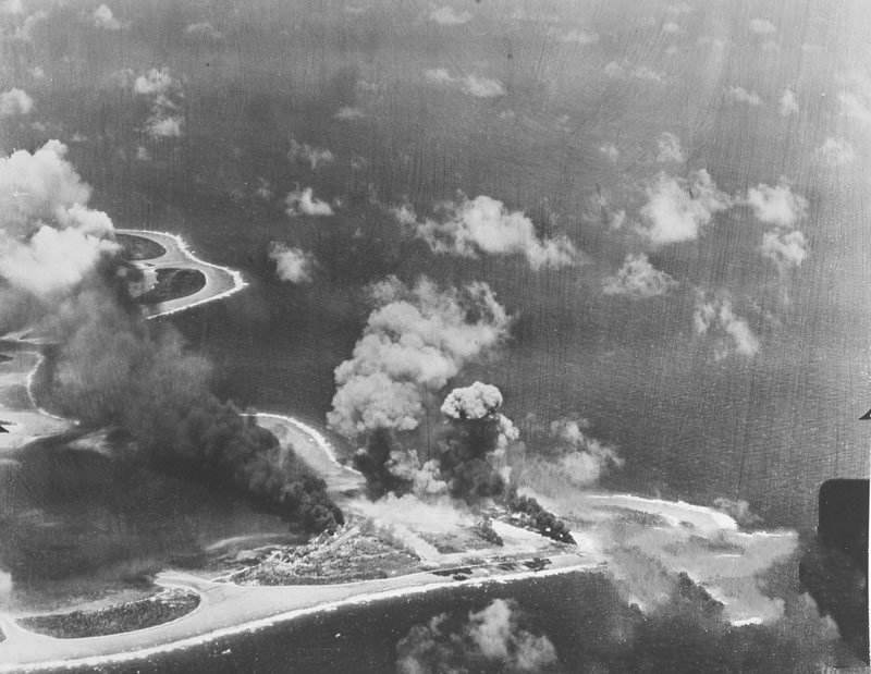 就在美日空军激烈空战时,从机群分离出来的“无畏”式俯冲轰炸机和“掠夺者”式鱼雷机对楚克的防御设施进行了猛烈的攻击。楚克的防御设施被炸得面目全非,损失很大。由于楚克的日军弹药库和油库被击中发生爆炸,使得岛上大火熊熊,黑烟滚滚,地面一片狼籍。