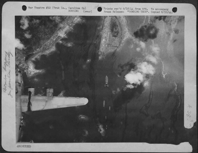 下午3点多钟,美军舰载攻击机第二波攻击再次降临被炸得满目凄凉的楚克。日军仅有几架飞机起飞迎战,其他飞机已被美军基本消灭,这几架飞机很难对抗强大的美国舰载机机群,一眨眼的工夫就在也看不到日本飞机了。没有了空中威胁,美军飞机在楚克上空随心所欲的进行轰炸,它们躲开地面防空火力的射击,将所携带的鱼雷和炸弹全部扔在了楚克,此情此景不仅让人想起了日本当年在美国珍珠港轰炸的情景,楚克已被炸得体无完肤,基本丧失了作为一个军事基地的重要价值。