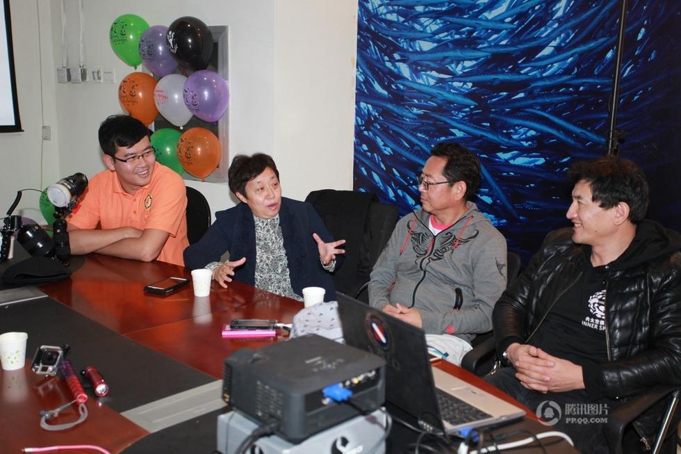 展览展出孟庆然、宋靖、吴立新、邱雷、冯严5位摄影师的水下摄影作品,他们当中有的是水下摄影的业界翘楚,有的是热爱潜水的摄影专业院校的师生,他们的水下摄影作品采撷自太平洋、印度洋、大西洋等洋流活跃的海域,各有独到之处。图为策展人冯严与作者交流。