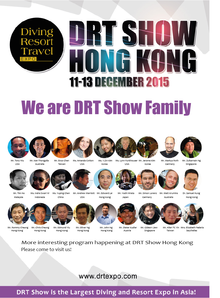 万众期待的潜水人聚会香港国际潜水展暨度假观光展(DRT Show)明天即将在香港会展中心开盛大开幕。今年看点依然不会让观众失望,来自全世界和本地的28位VIP演讲人出席说明会及研讨会。内容精彩纷呈不容错过。仅在香港DRT才能见到的新品设计大赛亦是年度重戏。同时,为了感谢对香港潜水业有着杰出贡献的人,组织方也将特别设立终身成就奖奖项,谁将获得此项荣誉,12月11日揭晓。