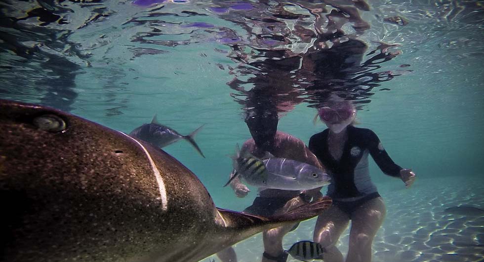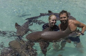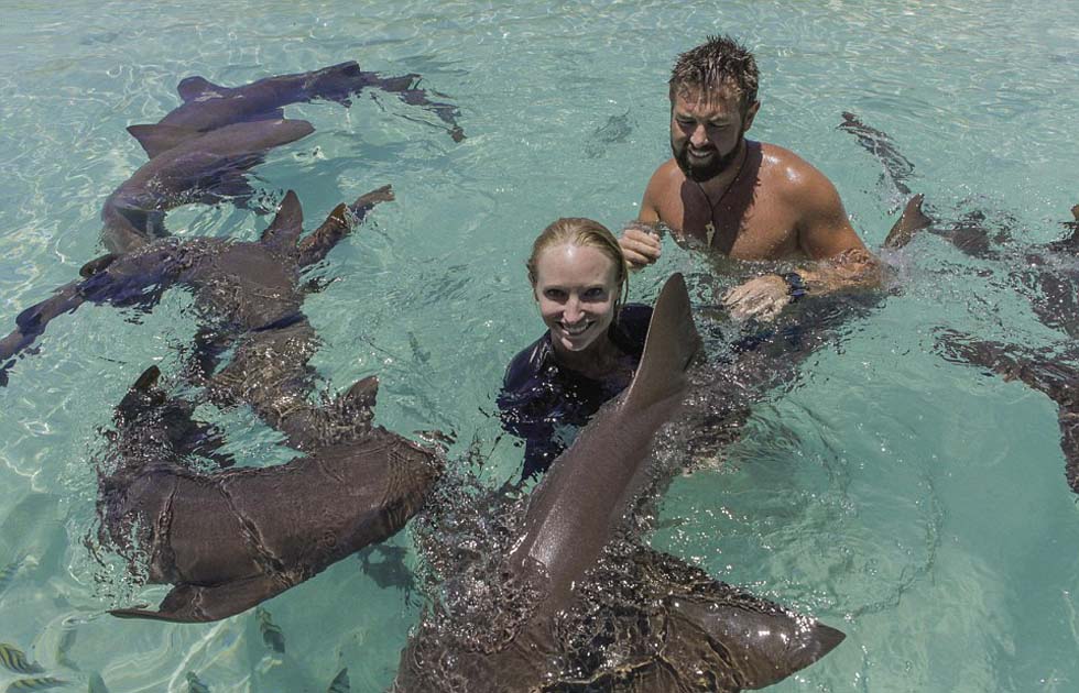 贾伦特和艾文丝一起潜水喂鲨鱼食物。