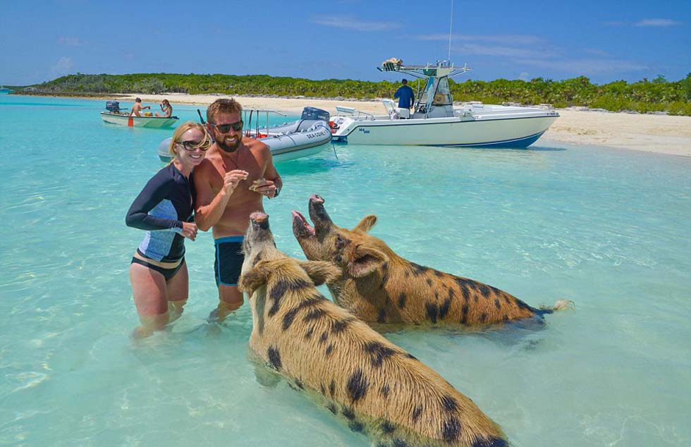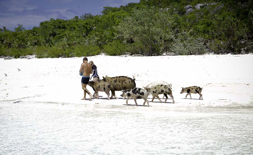 二人和岛上的“游泳猪”亲密接触。