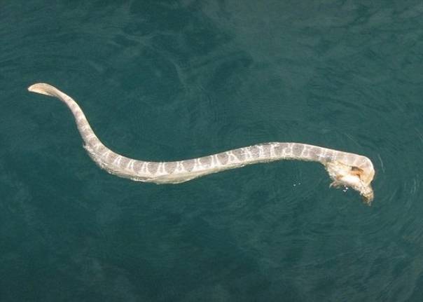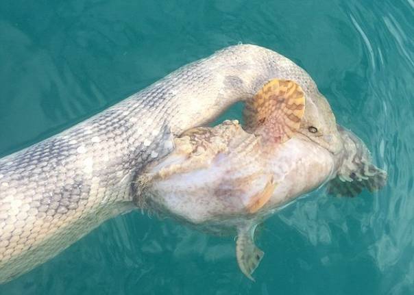 特里普表示,看到海蛇与石头鱼互相纠缠不放,海蛇一口咬着石头鱼的尾部,但石头鱼也在海蛇的身上咬出个大伤口,十分吓人。特里普先把他们捞起,将它们分开后再放回海里,但海蛇随即又去攻击石头鱼。