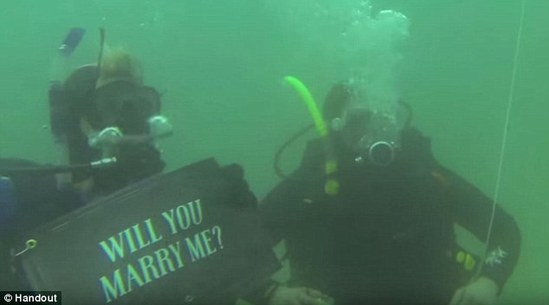 紧张而激动的Markie在潜到6米深的时候,发现正在潜水的女友,随即游了过去,举起条幅,向女友深情说到:“我曾对你承诺过在海底求婚,但现在我只拿到了18米的潜水证书,你会嫁给我吗?”