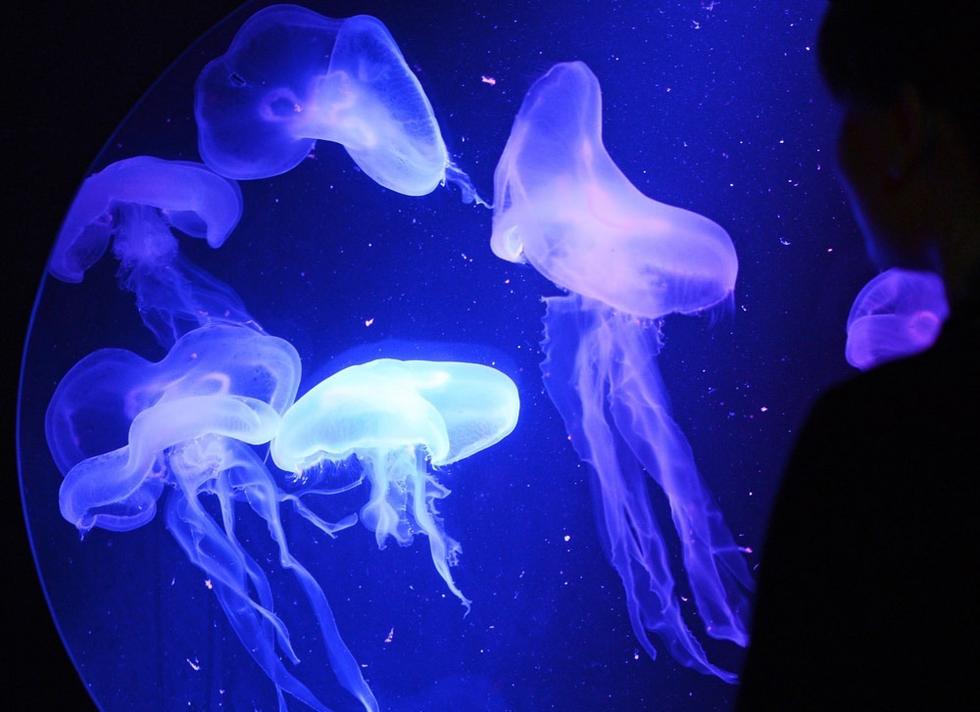 泛着蓝光的美丽水母在水族馆里漂浮着。